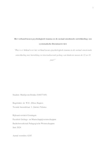 Brinke, Marlijn ten (2024) Het verband tussen psychologisch trauma en de sociaal-emotionele ontwikkeling: een systematische literatuurreview. Bachelor thesis, Pedagogical and Educational Sciences.