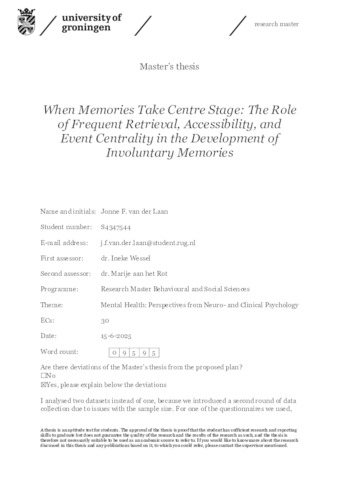 Laan, Jonne van der (2025) When Memories Take Centre Stage: The Role of Frequent Retrieval, Accessibility, and Event Centrality in the Development of Involuntary Memories. Research Master thesis, Research Master.