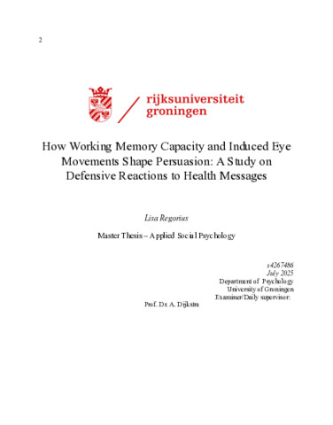 Regorius, Lisa (2025) How Working Memory Capacity and Induced Eye Movements Shape Persuasion: A Study on Defensive Reactions to Health Messages. Master thesis, Psychology.
