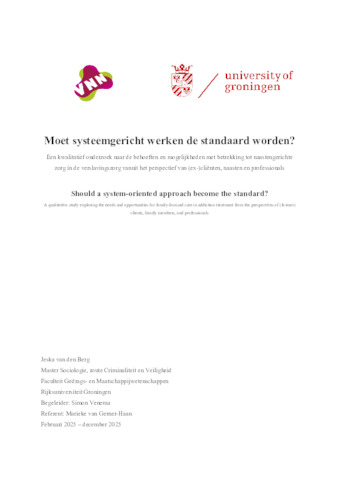 Berg, Jeska, van den (2025) Moet systeemgericht werken de standaard worden? Een kwalitatief onderzoek naar de behoeften en mogelijkheden met betrekking tot naastengerichte zorg in de verslavingszorg vanuit het perspectief van (ex-)cliënten, naasten en professionals. Master thesis, Sociology.