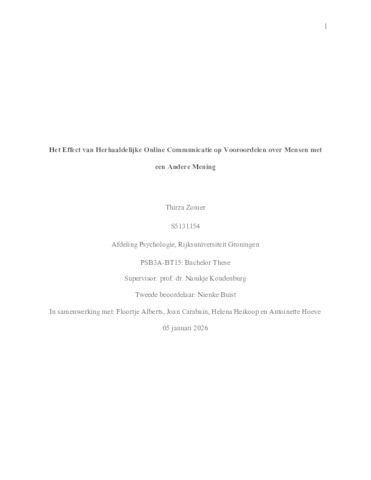 Zomer, Thirza (2026) Het Effect van Herhaaldelijke Online Communicatie op Vooroordelen over Mensen met een Andere Mening. Bachelor thesis, Psychology.