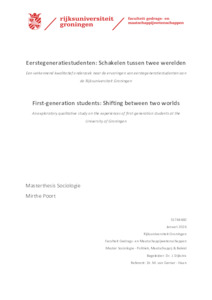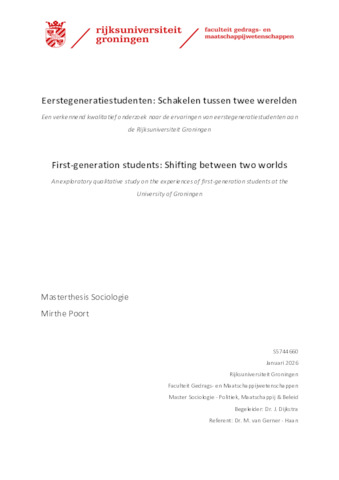 Poort, Mirthe (2026) Eerstegeneratiestudenten: Schakelen tussen twee werelden. Een verkennend kwalitatief onderzoek naar de ervaringen van eerstegeneratiestudenten aan de Rijksuniversiteit Groningen. Master thesis, Sociology.
