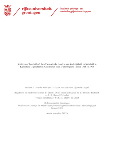 Van der Meer, Claudia (2026) Zwijgen of Begeleiden? Een Thematische Analyse van Zedelijkheid en Kuisheid in Katholieke Tijdschriften Geschreven voor Onderwijzers Tussen 1914 en 1960. Master thesis, Pedagogical and Educational Sciences.